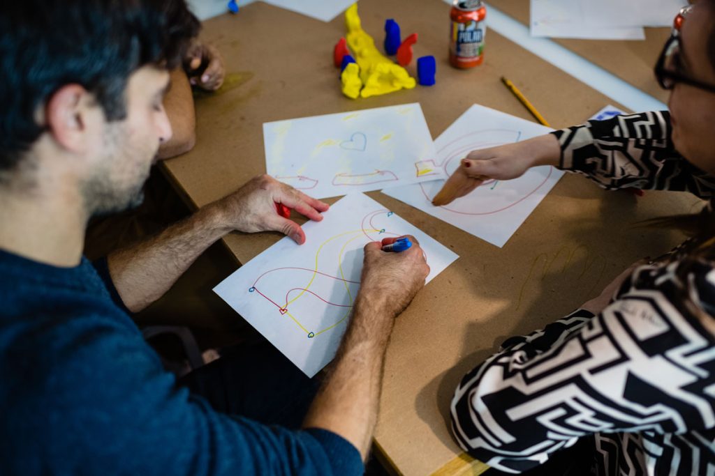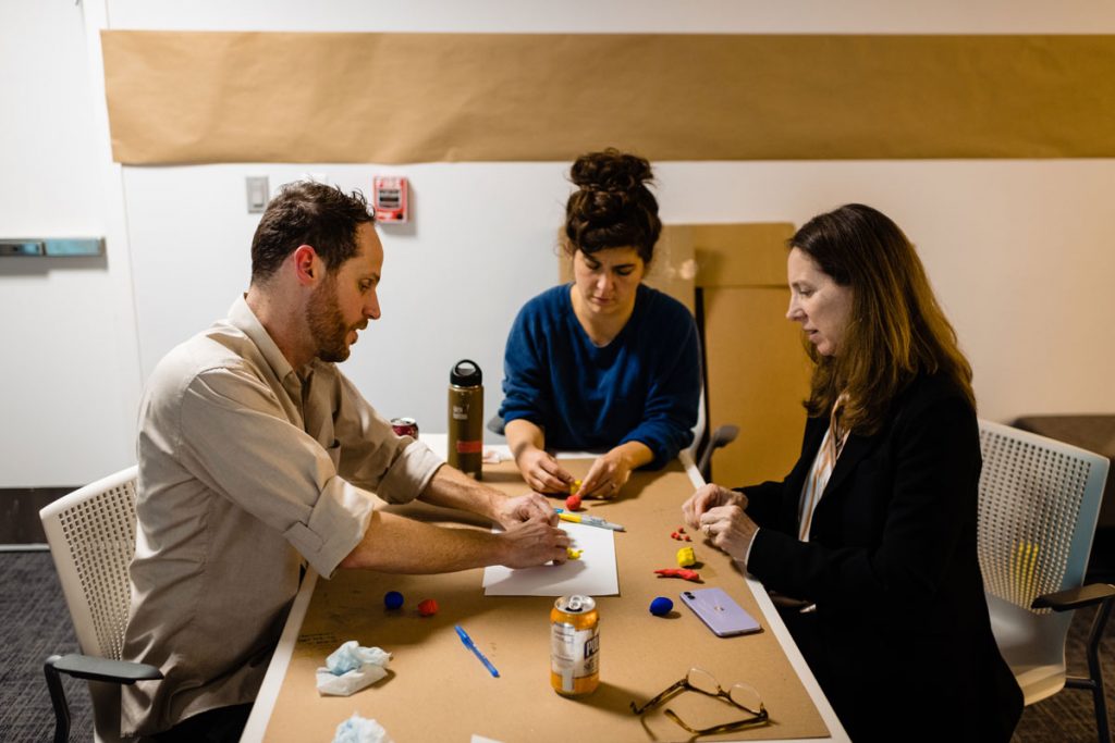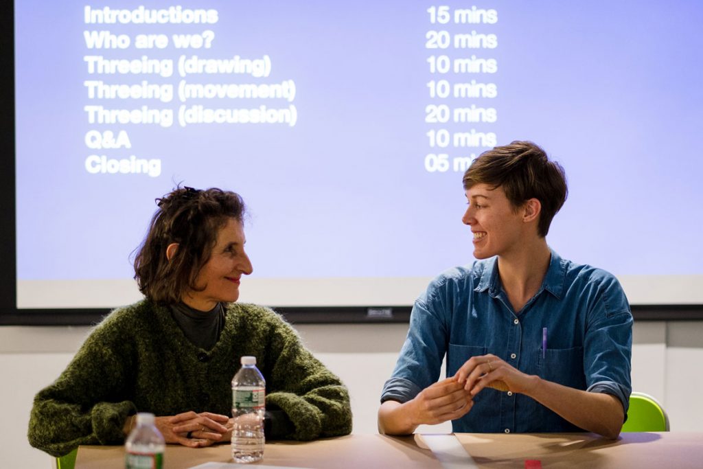 The workshop attracted a vibrant cross-section of RISD students, faculty, and leadership, as well as communities of practice including artists and educators from Rhode Island, Massachusetts, and New York. Participants explored Threeing, a verbal and non-verbal technique to promote “embodied creative practice and to bring awareness to the role each of us tends to play in collaborative settings.” Threeing was developed by the video-artist (not politician) Paul Ryan, between 1971 and the end of his life in 2013. It is “a voluntary practice in which three people take turns playing three different roles: initiator, respondent, and mediator.” Working in groups of three, participants used Threeing to create drawings, texts, and to be in dialog with one another, while rotating between the three roles. This workshop took inspiration from Making & Being, a book for educators that emphasizes contemplation, collaboration, and circulation in the visual arts and The Study Center for Group Work, a library of collaborative methods that have been developed by artists.
