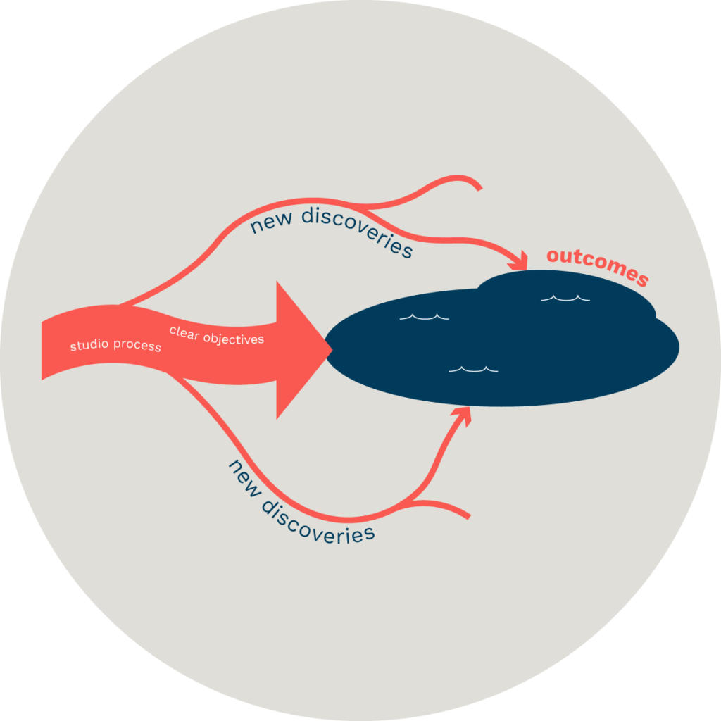 Individuals and groups working in a studio have dedicated time to allow for the creative process to take form with little to no road map. A studio is not rigid in its rules and processes and allows for dedicated time where happenstance and creative collisions can be noticed, explored, embraced, developed, and shelved.