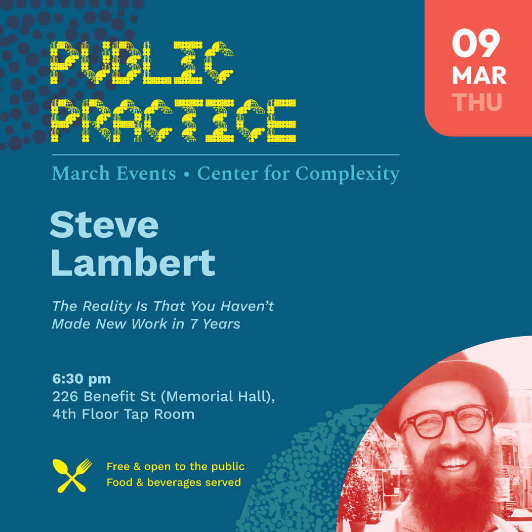 In collaboration with RISD faculty member Marisa Mazria Katz (Digital + Media), Center for Complexity welcomes Steve Lambert for a lecture and conversation about arts activism titled The Reality Is That You Haven’t Made New Work in 7 Years.