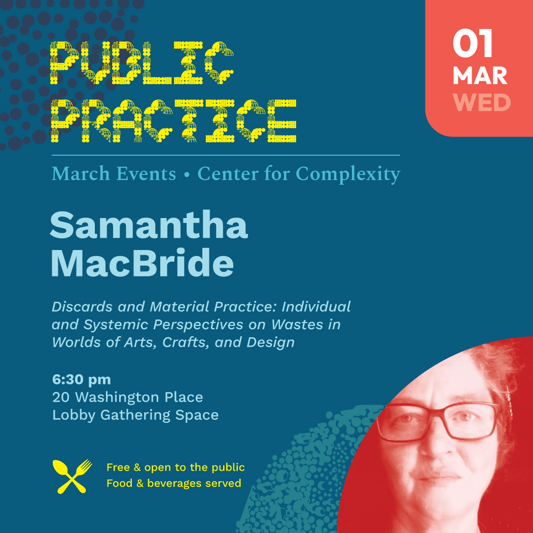 In collaboration with RISD faculty members Andrea Johnson (Landscape Architecture) and Laura Briggs (Architecture), Center for Complexity welcomes Samantha MacBride for a lecture and conversation about waste in creative practice, titled Discards and Material Practice: Individual and Systemic Perspectives on Wastes in Worlds of Arts, Crafts, and Design.