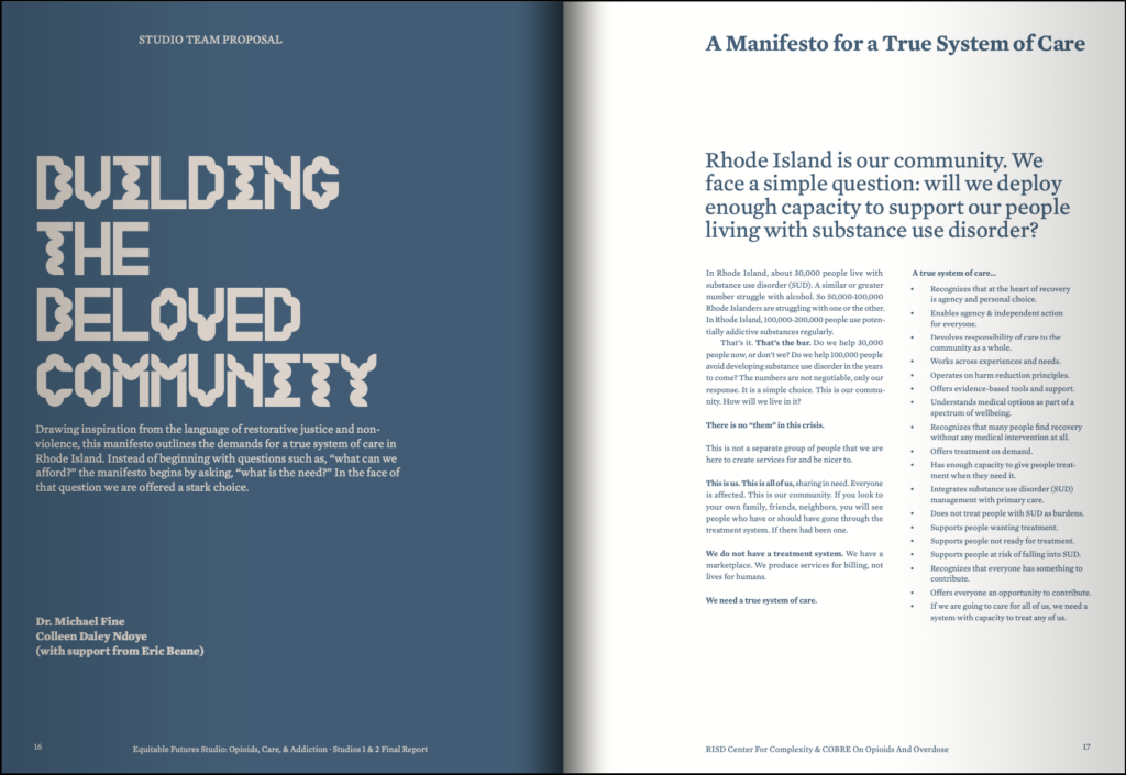 In July 2020, the CfC began a collaboration with the COBRE on Opioids and Overdose to create a mechanism for systems change in Rhode Island. In March 2021, with support from the NIH, the CfC and COBRE initiated a six-month process of design-led discovery organized around two intensive RISD-facilitated studios. The design studio format brings together a diverse group of stakeholders working across a shared challenge and provides a platform for open, guided inquiry into problems for which there are no simple or totalizing answers. Studios are a venue for research, experimentation, insight generation, and creativity — they accommodate the mess that comes with navigating uncertainty and embracing complexity as a matter of process. The studios set out to create a coordinated, interdisciplinary effort, and a structure for collaborative redesign and innovative solutions.