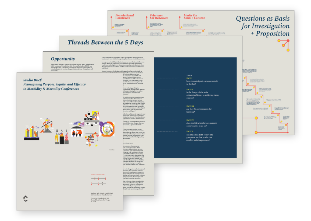 In January of 2021, after 6 months of research, planning, and design, CfC conducted its own internal Framing Studio to interrogate and reimagine the Morbidity and Mortality Conference (MMC). MMCs are a 100-year tradition across institutions and specialties started as a forum to provide education and accountability in medical practice. The Framing Studio began with a Studio Brief, developed and facilitated by two leads on the team. The Brief and support materials were then provided to all five team members by email and hard copies delivered by the USPS across four states – a process necessitated by pandemic remote working conditions. During our internal studio, we dedicated 25 scheduled studio hours to co-learning, reflecting, and testing ideas and prototypes, in addition to debriefing and adapting each day to the next.